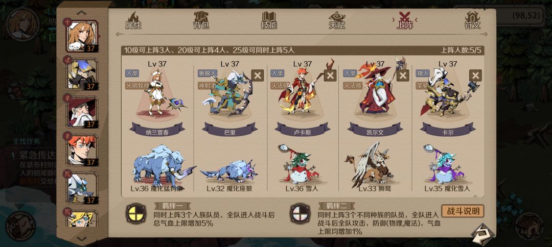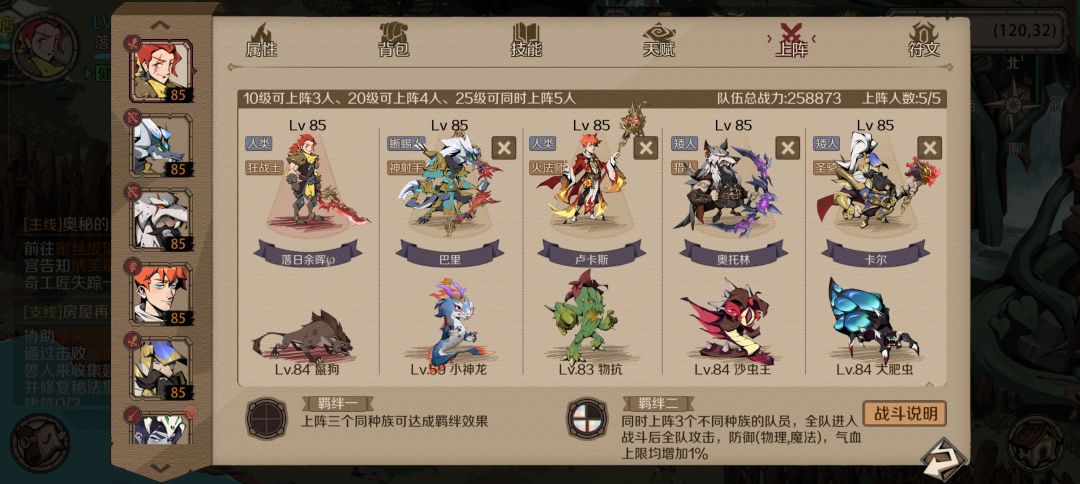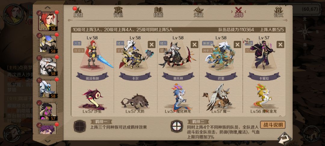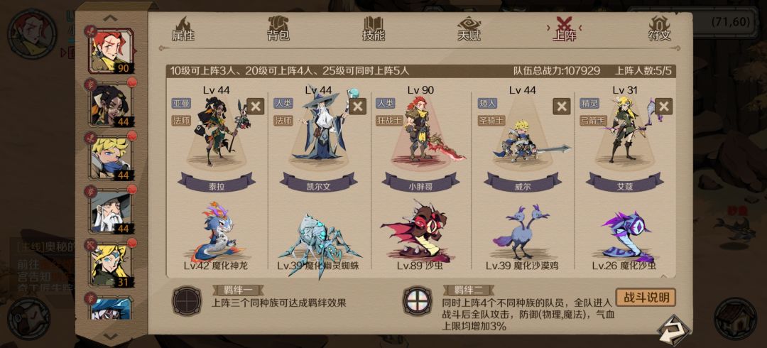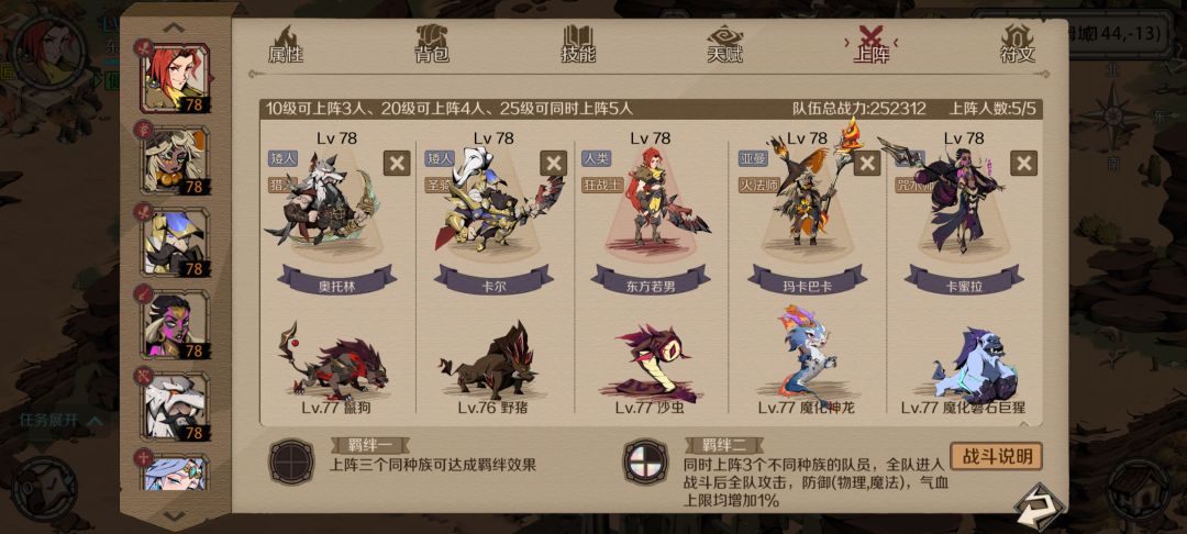 因为主要靠神射减抗+狂战输出,所以要尽量保住这两个,因此需要一个奶妈回血。 主角下不了,还剩一个位置,带巫术开局可以减20%血,然后宠物带光环低级宠,给c位加完buff后,被炎魔一拳刚好全部轰死,剩下靠神射和狂战慢慢磨,后面炎魔防御减下来后,狂战吸血高了就没那么容易死了,最后天赋斩杀带走。 要不是主角下不了,应该能打得更从容,肉盾打群伤纯没用,还跟c位抢奶妈,要不是还有个禁魔能控两回合,不然真就纯