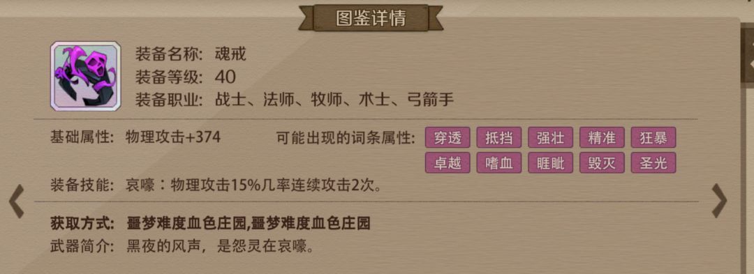 以上这些装备看似属性不好,但是有逆天的装备技能。 毒刀、毒弓,过比蒙多兽、黑龙等血条极厚但吃debuff的boss必备(吃眩晕、致盲、中毒、流血等负面减益)。 石化弓、触角法杖,石化弓小怪或者某些抗性低的boss必吃,触角法杖能让术士打控制,比如眩晕、致盲、石化、禁魔等,提高成功率。 魂戒给物理输出提供连击技能,例如狂战的突袭是可以吃的。 黑暗之翼、教主戒提供波动伤害。 鱼刀无视15%防御,配合神
