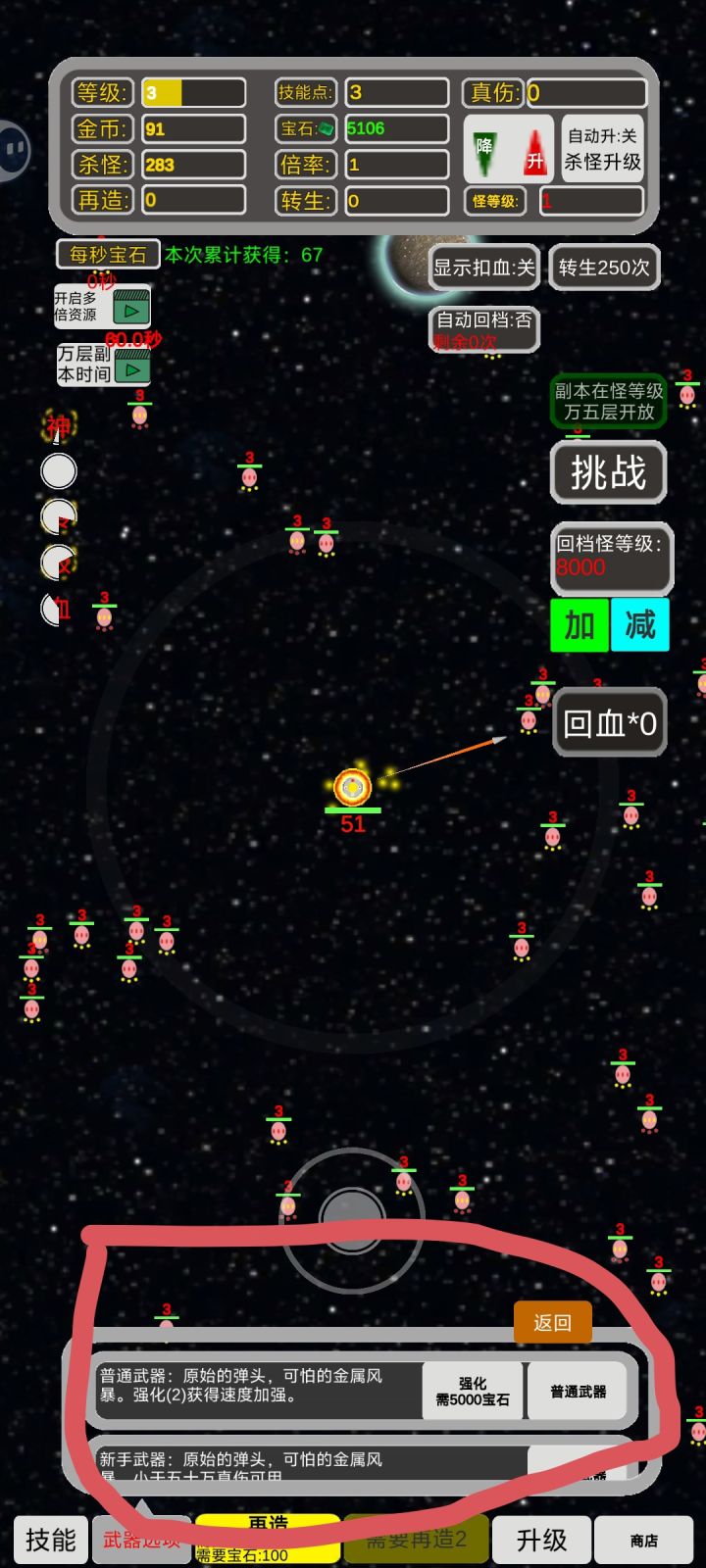 商店兑换血量⇆攒宝石转⇆商店多次召唤boss(多攒血量和真伤,真打不动就2000档)⇆怪物等级2000级后商店点2000档真伤(广告,会重置真伤技能加点以外所有)