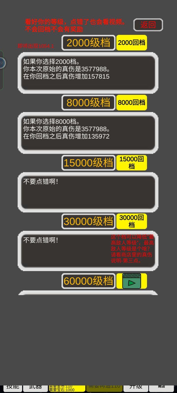 近期很多玩家说广告没什么作用,在这里写一个攻略,方便大家入坑。1----第一次玩。看图1,选择新手武器,杀死10个怪物,然后进入商店界面,在商店界面最右下角输入兑换码(兑换码在群里查获完全免费,就是为了吸引更多的人来讨论),兑换码每次回档后都可以再次输入领取。按照弹出的提示进行再造和转生(先把“转生保留怪等级“这个技能升两级)。应该到20转左右能把宝石用完。怪等级(就是层数),慢慢提升,主机等级