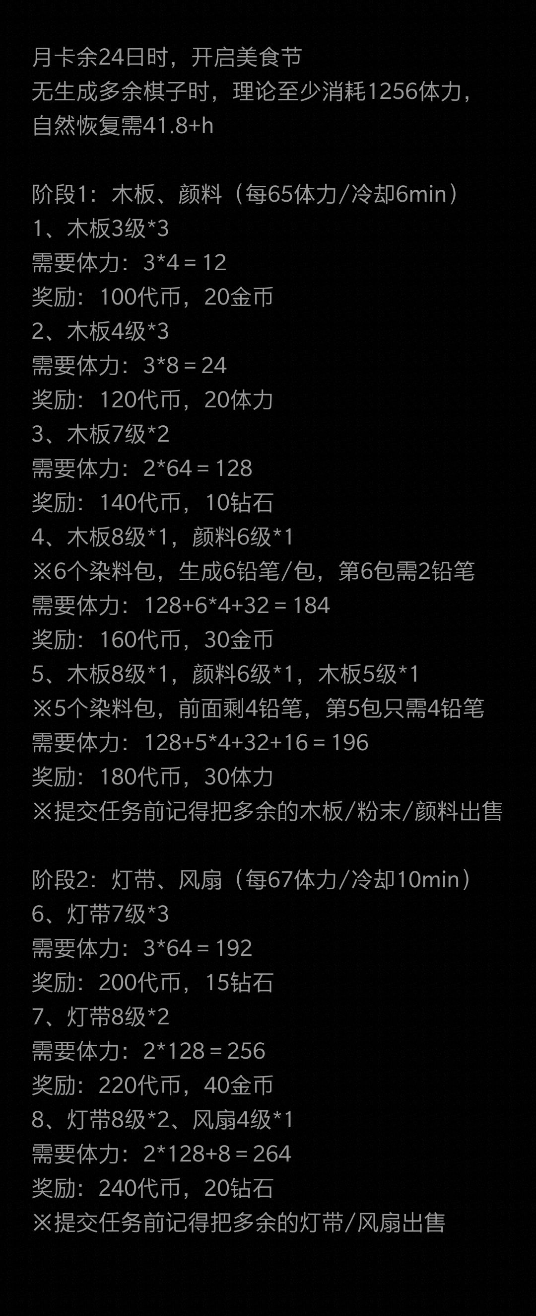 为了方便自己于是记录一下 棋子的名称就大概意思一下,看懂就行 (2024/5/7) 这期美食节重新记录并订正了一下部分数据,并记录奖励部分,需要花费体力部分也写详细了一点 至少消耗1256点体力,但加上多余的红粉末颜料风扇等棋子,肯定要大于这个数字,不过体感不会多太多 理论全靠自然恢复的体力能完成,加上任务给的体力和日常各种方式获取的额外部分压力会减轻一些 期间不要将体力花在任务以外的棋子上,冷却