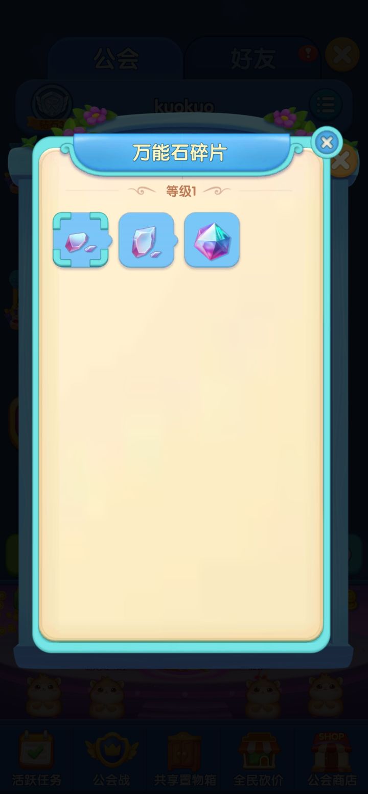 67级啦,我印象里应该是没有充值过的。玩的虽然慢,但是也算是小有收获。最喜欢的就是万能石。万能石:可对任意(非生产器)棋子使用,使棋子升高一级。点到万能石的时候,可以升级的棋子都是高亮显示,生产器是灰色的。注意不要随意拖动,防止误用。万能石可以直接得到,也可以由万能石碎片合成。4个1级碎片=2个2级碎片=一个万能石。 万能石我建议用在次最高级上:比如13级茶具,14级糕点拼盘上。次之就是1