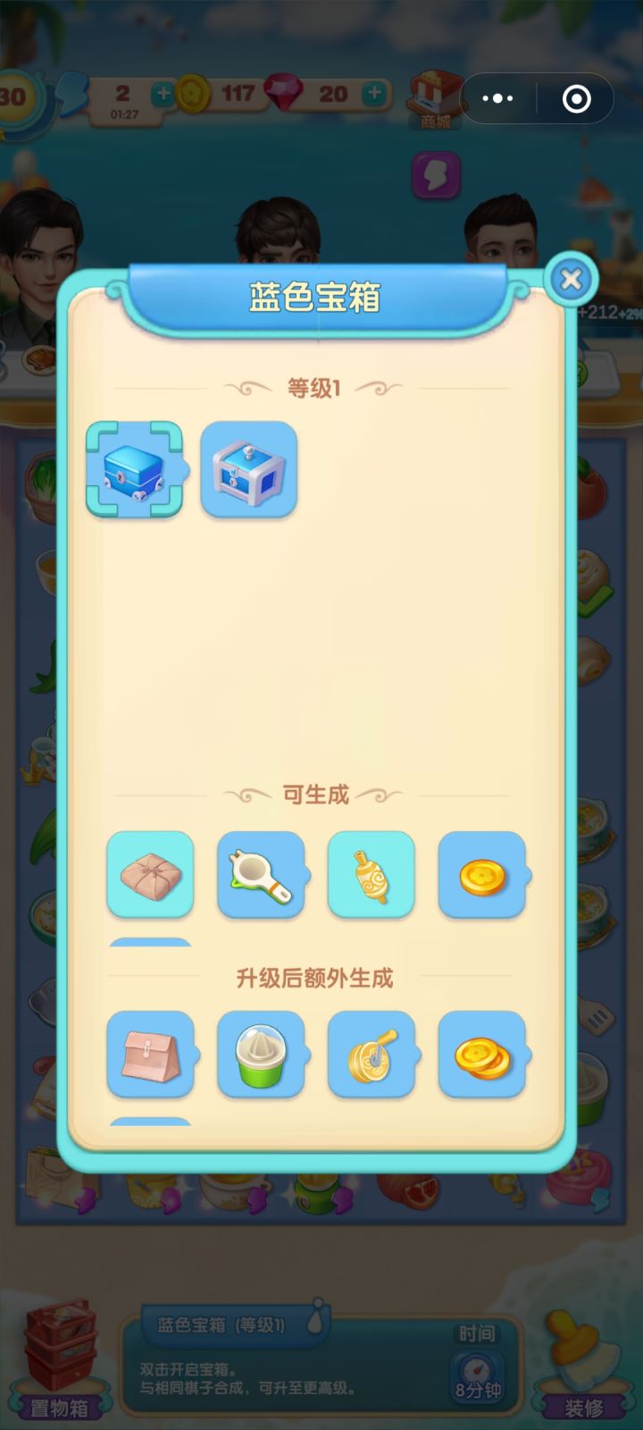 刚开始玩的,有可能忽略了箱子也是能升级的,升级后能有质的变化。箱子种类:蓝色,紫色,甄选。蓝色是榨汁机,购物篮,鱼缸的基础零件来源。紫色是果蔬篮,冰箱,炖锅的零件来源。甄选是生产成品和钻石。箱子来源:一是做主线任务,二是人物升级赠送,三是每日活动。拿到箱子别急着开,可以升级后再开,效果要好太多。