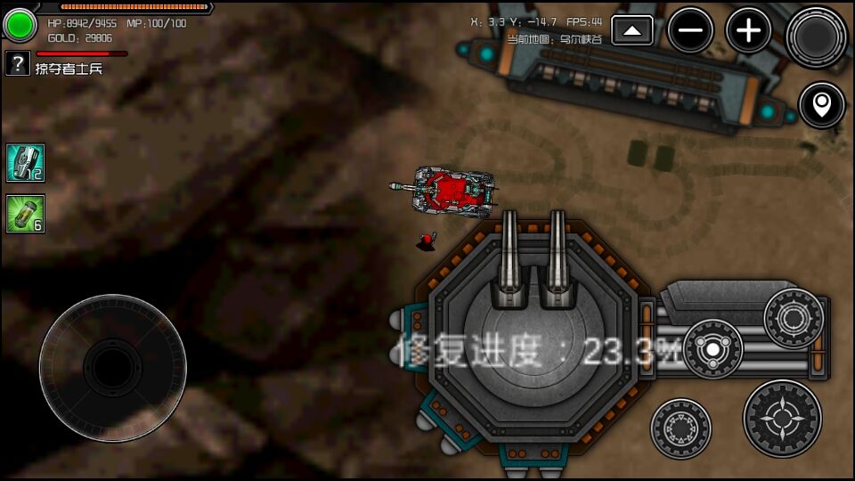 #经验 #重装无限 到视频所在的位置,依靠本来废弃的坦克当做掩护,摆好自己的坦克,下车挂机。 需要八个防尘口罩,几个回血药剂。 吸引火力,让防御炮塔攻击就可以了。 偶尔会被穿模的子弹击中,并不影响,就连BOSS都会被防御炮塔摧毁。 一场下来二万钱,扳手螺丝等道具看运气。 经验没有刷高达高,不过很轻松一直挂机点一下对话回复一下血量就可以了。