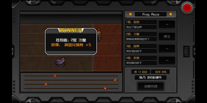 这个游戏的特色之一就是玩青蛙机获得奖卷兑换超(神)强(器)武器,怎么玩好选择好青蛙是决定胜利的关键,下面我分享我玩了一个多小时的青蛙机总结出的青蛙最佳状态表现经验。(备注青蛙机在灰色者基地中的酒馆里)1青蛙最佳状态表现 沙皇是(鼓起来了),哈利是(神秘的气息),亚瑟是(吐了口烟),路易是(低下了腰),凯撤是(发出了嘟嘟声),拉破轮是(鼓起来了)。2在有大于1只的最佳状态的青蛙比赛中:哈利(神秘