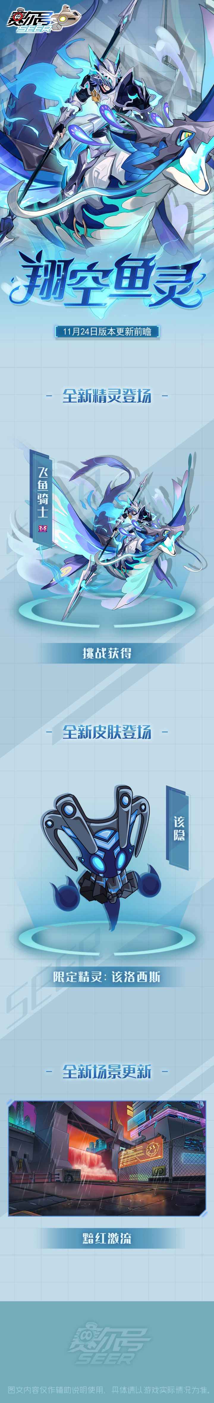 亲爱的小赛尔,11月24日赛尔号新版本“翔空鱼灵”即将到来!◆全新精灵【飞鱼骑士】即将登场!◆经典皮肤【该隐】即将登场!◆全新场景【黯红激流】更新!查看下方长图,获取新版本的更多信息吧~