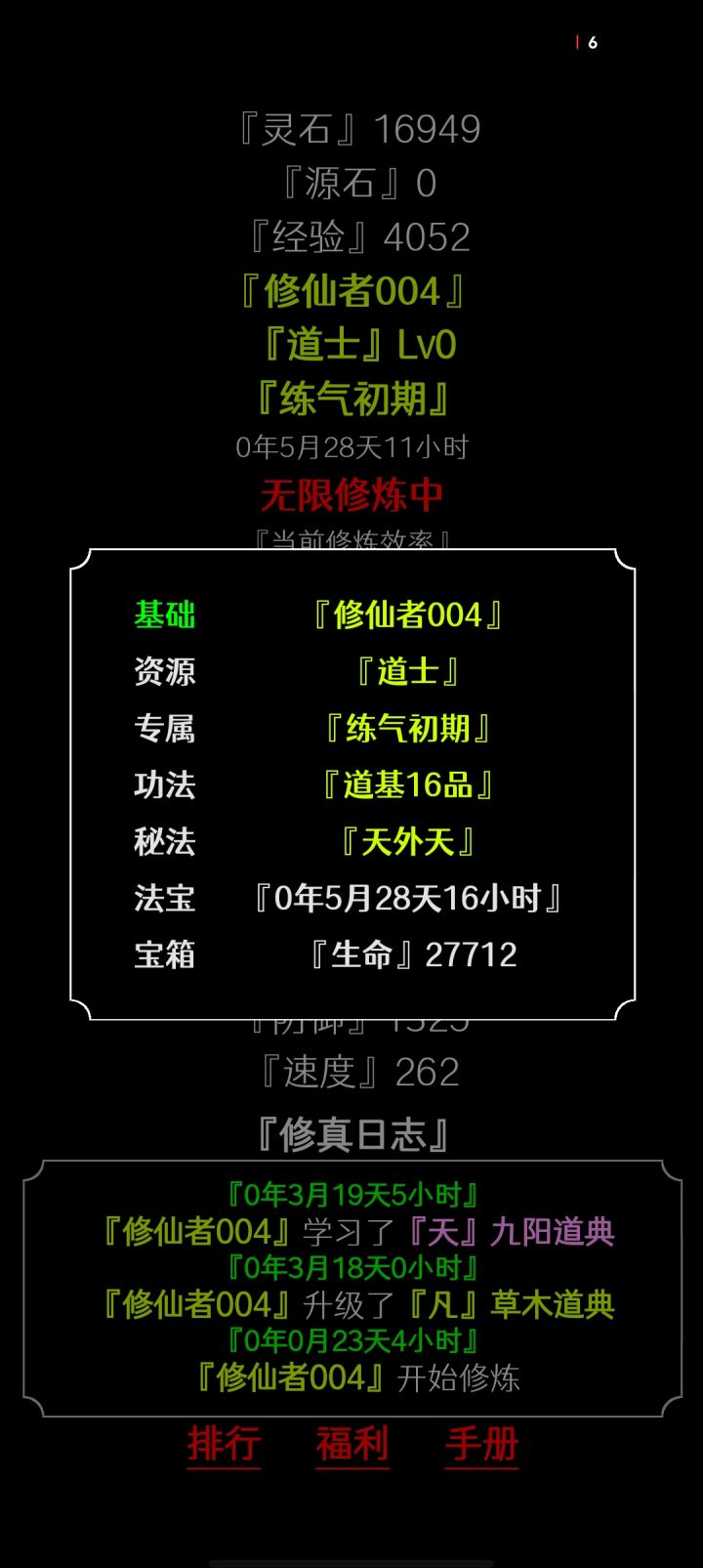 ○开局点修炼,最底下福利领了,先把宝箱升到稀有,剩下的拿去突破-蕴养道基(这玩意境界越低要的灵石越少,突破金丹需要8品道基),然后行动力开宝箱,大概开个700、800个,之后翻纳戒法宝,有开出来的装备穿上,没有就不管他。◇进阶-合成-秘法,选一个自己职业的最高级秘法,能合几个合几个(同一本,不同也可以,随便你),弄好去纳戒学习了,功法也是选最高级的(有了功法之后修炼速度加快),碎片不够就开宝箱,