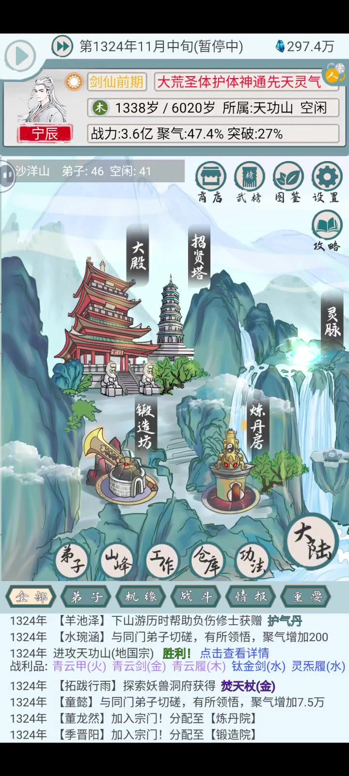 说明一下,准备长期挂机(刷人才/资源)和加深宗门历史底蕴(刷年度),若能坚持到大后期(仙人大膨胀阶段)我将保留以后勤类(炼丹、炼器、探索、种植、采矿)以相应灵根及圣体+红色+金色天赋为主,如炼丹:火灵根+昆仑圣体+六丁神火+炼火掌控,探索:木+伏羲+洞察玄机+丛林领悟和战斗类大荒+青龙+护体/神佑等为主的这些人物。至于所谓昆仑仙人则是昆仑阵用途、一般是水/金灵根,若有人员多为了美观、后期应统一以昆