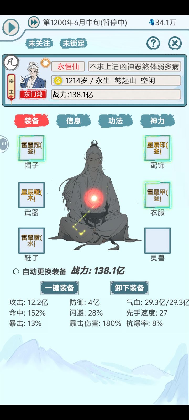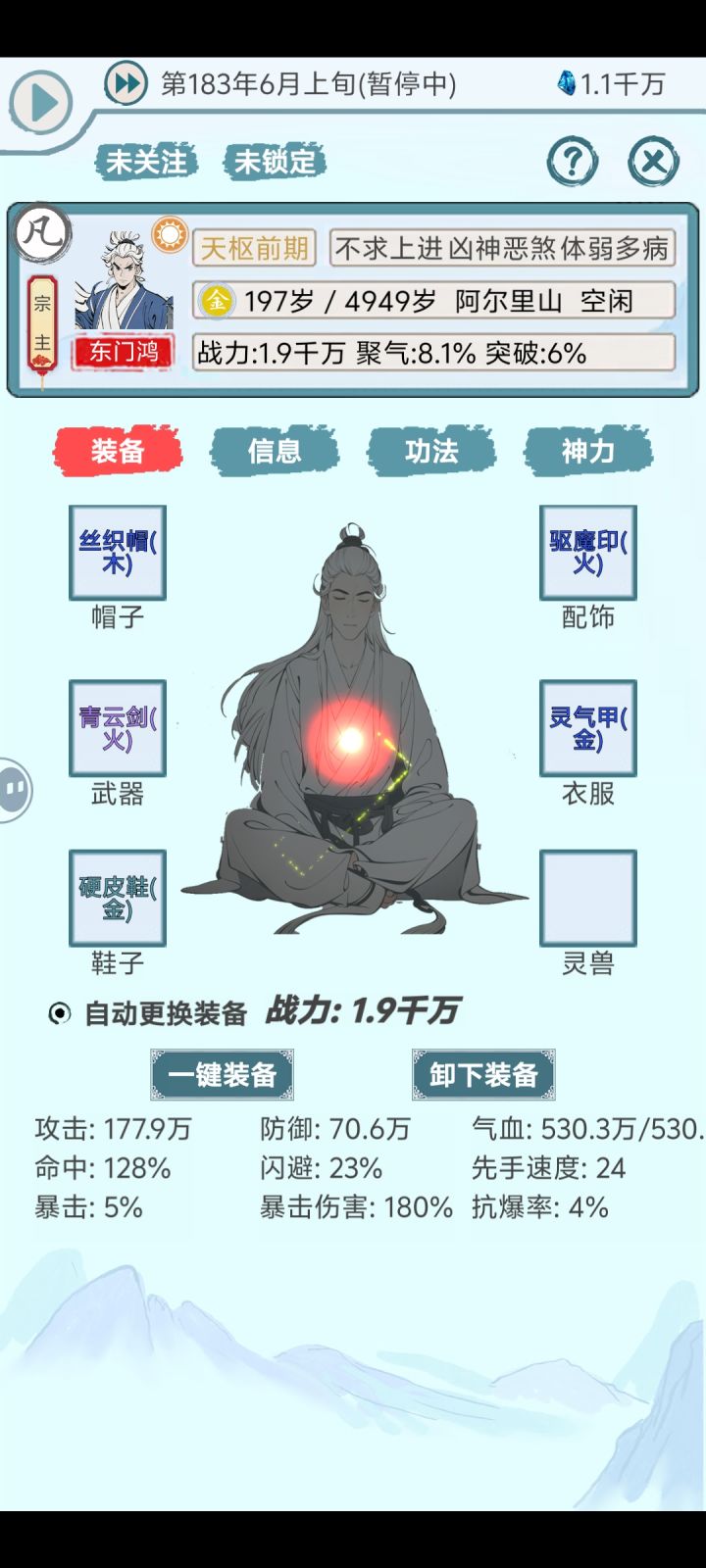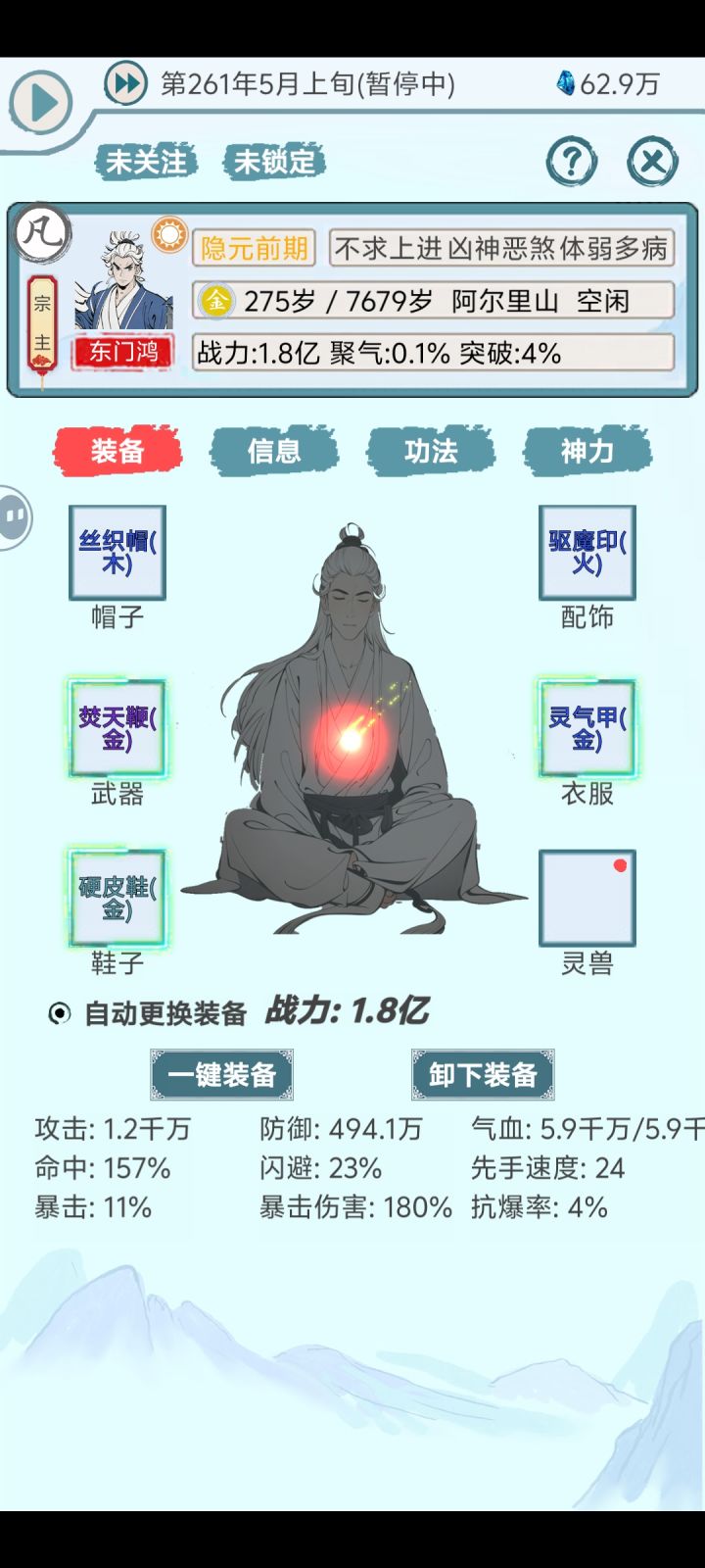 说明一下,准备长期挂机(刷人才/资源)和加深宗门历史底蕴(刷年度),若能坚持到大后期(仙人大膨胀阶段)我将保留以后勤类(炼丹、炼器、探索、种植、采矿)以相应灵根及圣体+红色+金色天赋为主,如炼丹:火灵根+昆仑圣体+六丁神火+炼火掌控,探索:木+伏羲+洞察玄机+丛林领悟和战斗类大荒+青龙+护体/神佑等为主的这些人物。至于所谓昆仑仙人则是昆仑阵用途、一般是水/金灵根,若有人员多为了美观、后期应统一以昆