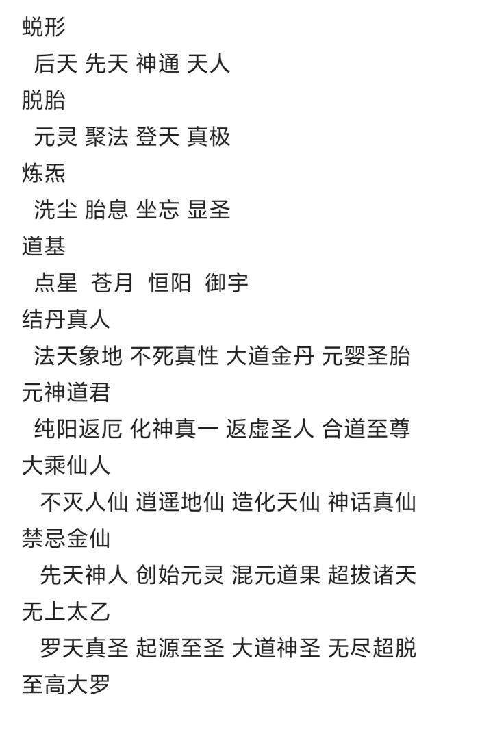 比上一次发的稍微修改了些:蜕形(后天 先天 神通 天人脱胎(元灵 聚法 登天 真极炼炁(洗尘 胎息 坐忘 显圣道基(点星 苍月 恒阳 御宇 结丹真人 元神道君 大乘仙人 禁忌金仙 无上太乙 至高大罗