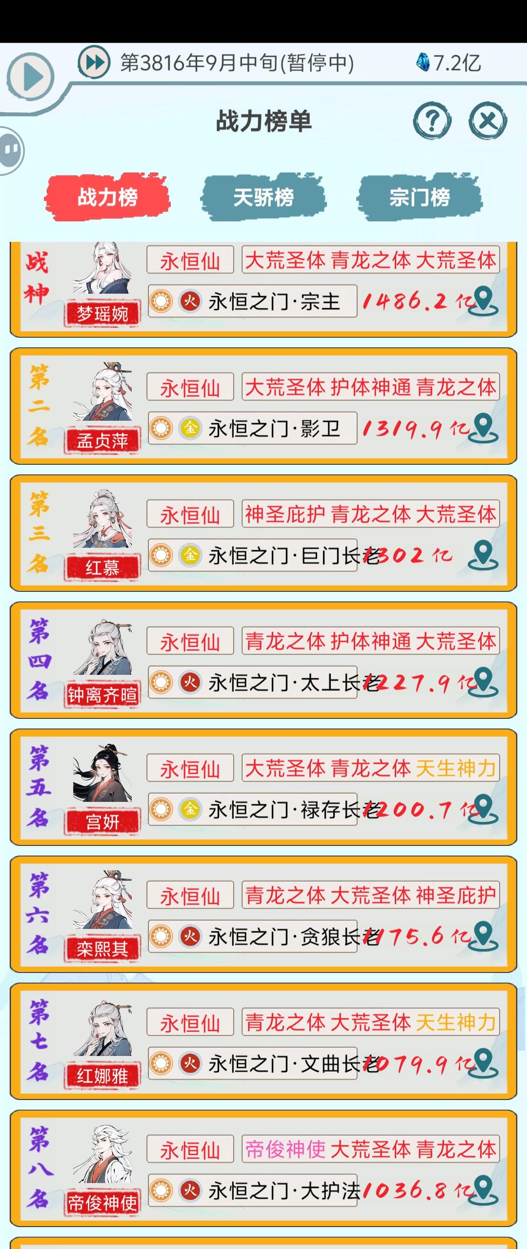 官方Q群8835298121,开局可刷天赋可不刷,由于本人是玩帝君流派的#刷天赋选择,青龙之体{必选},大荒圣体{必选}最后一个天赋为备选(护体神通),(神圣庇佑),(致命一击)击杀敌人拿称号用的,(天罗地网)俘虏敌人用的。其它天赋不做考虑2,进游戏后,新手引导结束后先去招贤塔里面看看初始弟子,会送两个,不用看招贤令刷弟子3,点开大殿,点击宗门封赏可以自动让弟子装备,吃丹药4,点开仓库