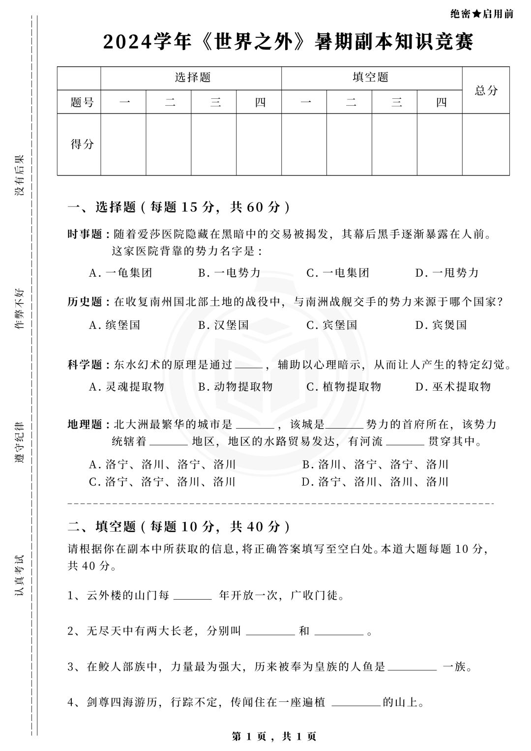 📖《世界之外》暑期副本知识竞赛 ✦Bilibiliworld现场统考热度不褪,为满足玩家高涨的考试热情,特开启《世界之外》暑期副本知识竞赛。 ✦副本知识竞赛试卷已送达,请保存配图进行作答。 ✦回忆无限世界,记住你的每一个心跳细节。 “怪物的心,诡叙的爱” ——··——··—— 微博搜索:世界之外官方微博 B站/公众号搜索:世界之外官方 小红书搜索:世界之外 抖音搜索:世界之外手游 #世界之外
