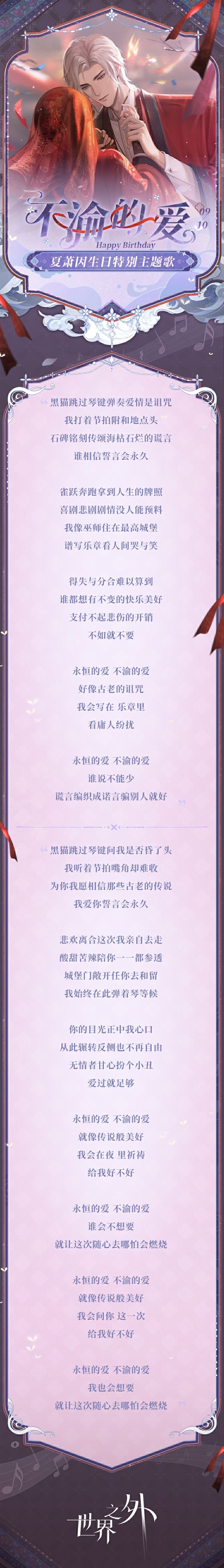 永恒的爱,不渝的爱, 谁会不想要; 就让这次随心去,哪怕会燃烧。 “我心里认定是你, 那就是你了。” 🎂祝夏萧因,生日快乐! 🌙特殊时刻到来,「江山不夜」特别副本剧情,已在9月10日00:00刷新。 “世界无限,此爱不变” ——··——··—— ✦ 各平台搜索>>世界之外,查看更多官方资讯。 ✦ 《世界之外》官方玩家群: 官方⑤群:857187939 官方⑥群:232367272 #世界之外