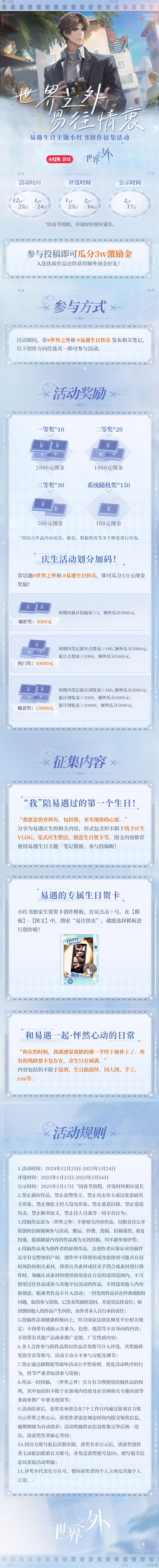 世界之外「易往情衷」创作征集活动开启!爱是明知的执着。 “可这个世界多寂寞,若不爱你,还能做什么” ✦活动时间✦ 2024年12月25日-1月24日 ✦征集内容✦ · 围绕《世界之外》男主易遇生日主题,用任意形式表达对易遇的生日祝福。 · 形式包括但不限于:线下庆生VLOG、整活、创意生日贺卡等。 ✦参与方式✦ · 活动期间,在【小红书】平台带#世界之外 # 和#易遇生日快乐 # 双话题发