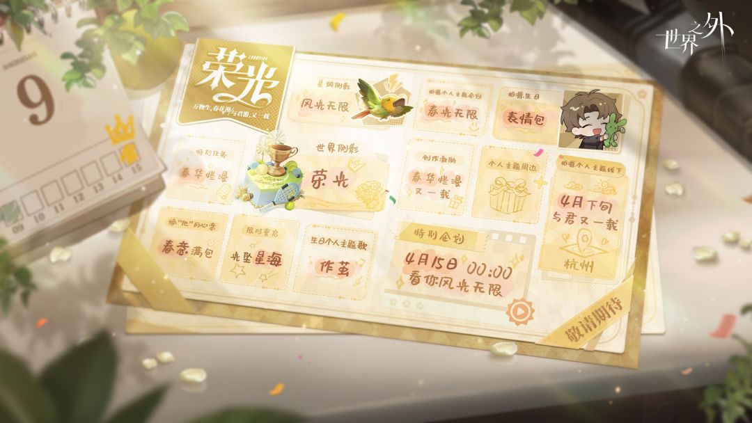 🍃柏源生日系列活动日程表,现已送达! 又逢一载春光,此刻有你,便是万般圆满…… ✦心意礼品 · 春意满包✦ 为他准备一份你独特的心意礼物吧。 ✦世界侧影 · 荣光✦ 与万千鲜花和掌声一起,见证“他”的荣光。 ✦特别任务 · 春华烂漫✦ 烂漫春日,与他携手漫游…… ✦限时重启 · 光坠星海✦ 你是否还记得……那个光影迷离的梦? ✦柏源个人主题歌 · 作茧✦ 解锁特别音乐彩蛋。那些胜利荣耀时刻,有你在