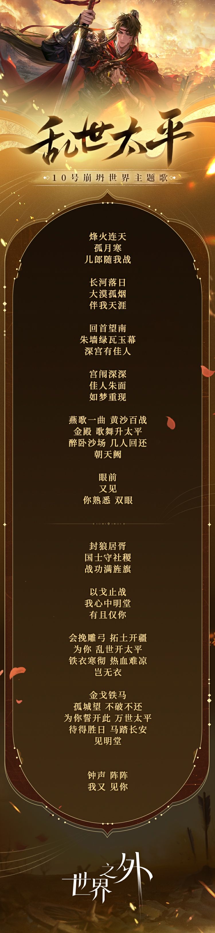 关联人物:柏源 “燕歌一曲,黄沙百战, 金殿歌舞升太平; 醉卧沙场,几人回还, 朝天阙。 眼前又见, 你熟悉双眼。” 🎶 《世界之外》10号崩坍世界主题歌「乱世太平」,现已上线网易云音乐。 ✦欢迎点击:https://music.163.com/# /song?id=2680673666,或进入网易云歌手主页「世界之外」,点击专辑“乱世太平”进行收听。 🎶在「燕歌行世界之间」感召总次数达10