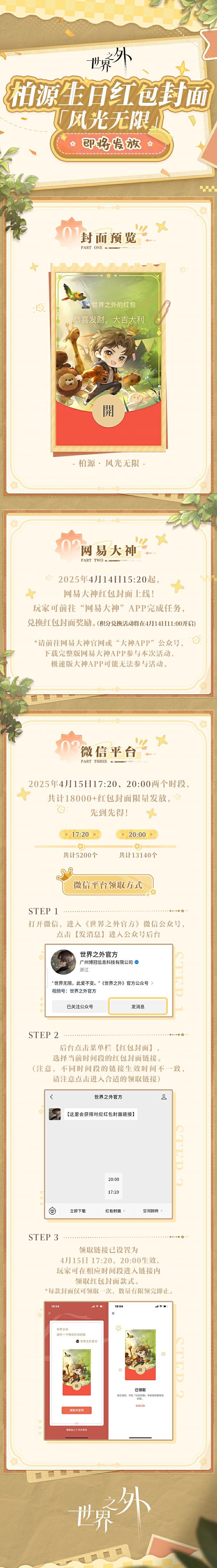 🧧4月14日-4月15日,即将陆续发放《世界之外》柏源生日限定红包封面:「风光无限」。 ✦玩家可通过玩家可通过网易大神、微信公众号“世界之外官方”后台领取。 ⭐发放时间 ✦网易大神:4月14日15:20,共计10000个红包封面限量发放。进入网易大神相关活动页面,完成积分兑换任务,即可兑换红包封面。 *积分兑换任务将在4月14日11:00开启。 ✦微信平台:4月15日17:20、20:00两个时间