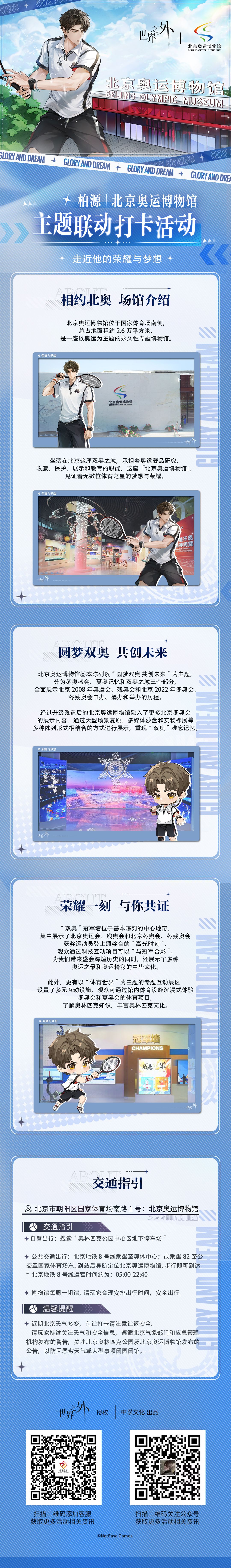 🎾走进「北京奥运博物馆」 北京奥运博物馆,是一座以奥运为主题的永久性专题博物馆。本次联动活动,愿能与你一起走进这座双奥之城,共同了解奥运知识,弘扬中华体育精神。 🎾「荣耀与梦想」主题联动打卡活动,即将开启! ✦打卡时间✦7月26日-8月7日 ✦打卡地点✦北京奥运博物馆 ✦无料领取✦北京奥运博物馆 · 文创区 ✦无料领取规则✦ · 前往「荣耀与梦想」无料领取点,出示《世界之外》账号ID页面,即可领取