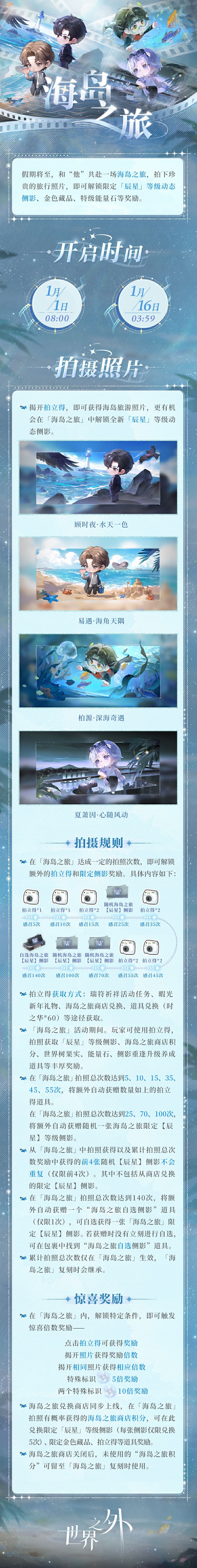 与“他”相约一场海岛之旅, 共同拍下旅行照片吧! 🌊《世界之外》 | 三亚旅文 联动主题「辰星」动态侧影现已上线! ✦1月1日08:00-1月16日03:59期间,使用拍立得进行拍摄,即有机会解锁海岛之旅「辰星」动态侧影、藏品等奖励。 🏝「海岛之旅」活动细则 ✦使用【拍立得】拍照,达成特定条件即可触发惊喜倍数,最高可得十倍奖励。 ✦在「海岛之旅」拍照总次数达到5、10、15、35、45、55次,