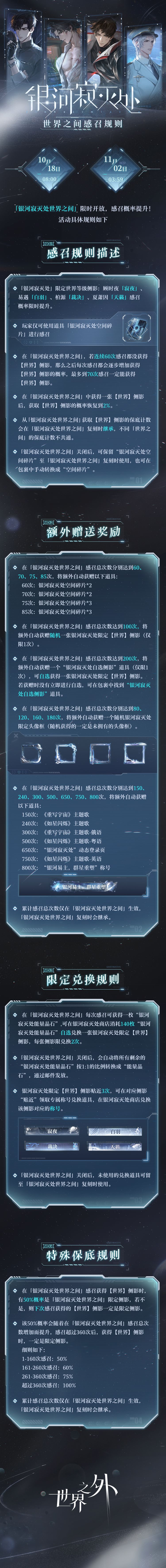 10月18日08:00-11月02日03:59「银河寂灭处世界之间」限时开放,感召概率提升!活动具体规则如下: 🌌「银河寂灭处世界之间」感召规则 ✦「银河寂灭处」世界等级侧影感召概率限时提升,玩家仅可使用道具「银河寂灭处空间碎片」进行感召。 ✦若连续60次感召都没获得【世界】侧影,那么之后每次感召都会逐步增加获得【世界】侧影的概率,最多到70次感召一定能获得【世界】侧影。 ✦在「银河寂灭处世界之