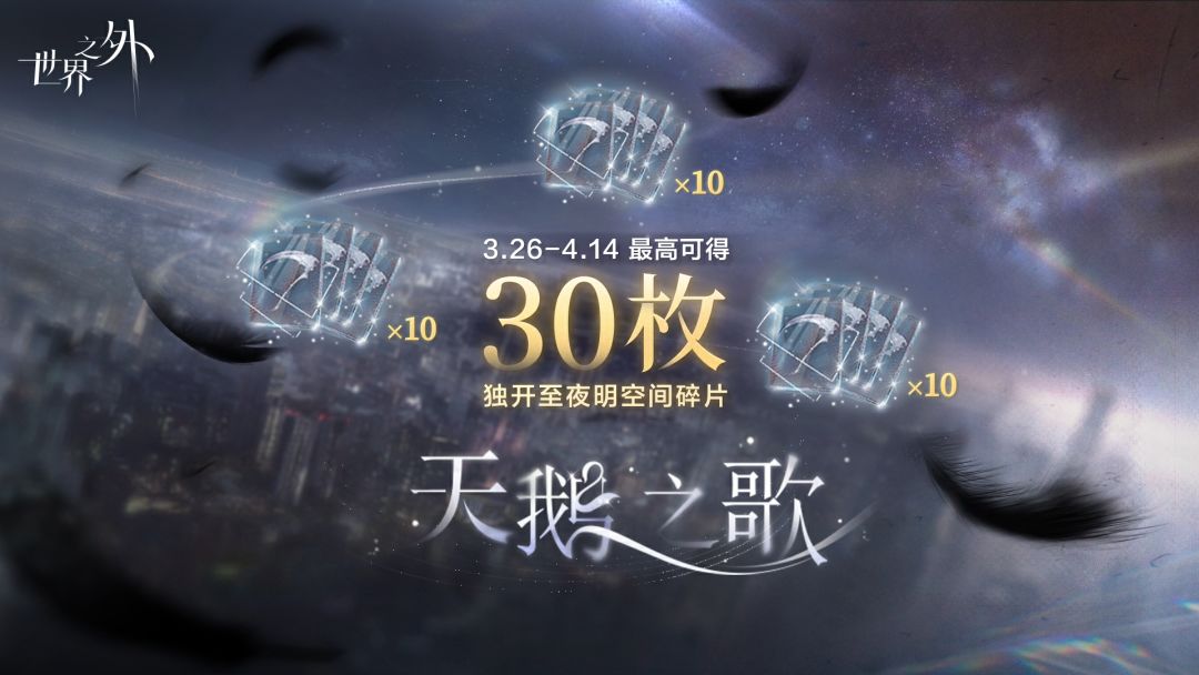 “葬送无边春色,迎来夏阳生。” 🌃3月26日-4月14日,满足条件可得最高30枚「独开至夜明空间碎片」 · 累计登录3天,即可免费领取「独开至夜明空间碎片」10枚。 · 活动期间充值或礼包满10元,即可再领「独开至夜明空间碎片」10枚。 · 购买世界之吻或礼包满100元,可继续领「独开至夜明间碎片」10枚。 “永夜将明,向死而生” ——··——··—— ✦ 各平台搜索>>世界之外,查看更多官方资讯
