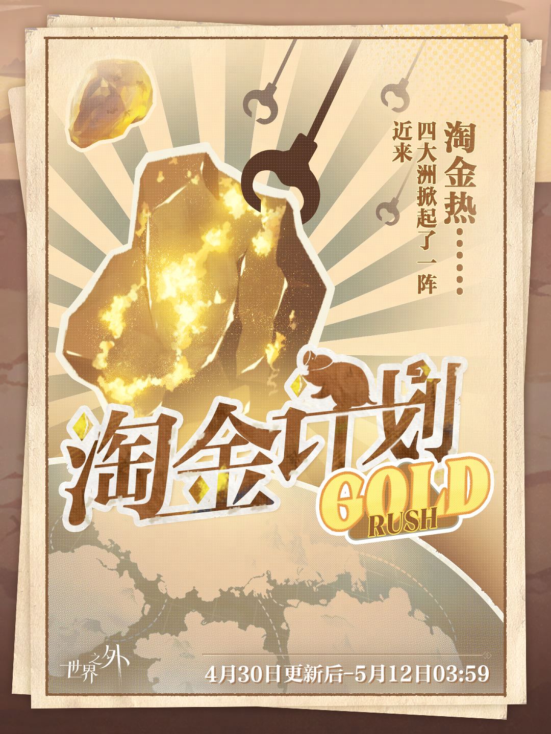 近来,有人在四大洲发现了一些金矿… 请你加入这阵淘金热,探索开矿致富之路! ⛏ 4月30日更新后-5月12日03:59,特别活动「淘金计划」限时开启。勘探矿藏区域,和他一起开采黄金! ⛏ 勘探矿区,称重矿石,即可解锁时之华、红线、侧影升级养成道具、晶币等资源奖励。 “世界无限,此爱不变” ——··——··—— ✦ 各平台搜索>>世界之外,查看更多官方资讯。 #世界之外