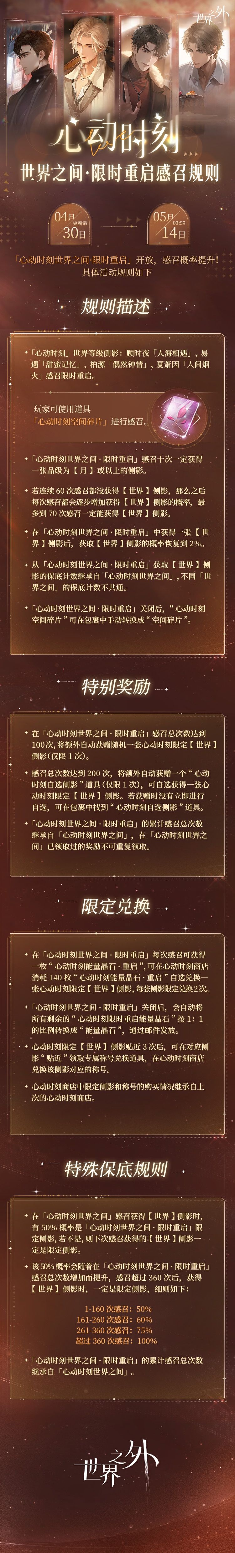 4月30日更新后-5月14日03:59,「心动时刻」世界之间限时重启。 💌「心动时刻世界之间 · 限时重启」感召规则 ✦「心动时刻」世界等级侧影感召概率限时提升,玩家仅可使用道具「心动时刻空间碎片」进行感召。 ✦若连续60次感召都没获得【世界】侧影,那么之后每次感召都会逐步增加获得【世界】侧影的概率,最多到70次感召一定能获得【世界】侧影。 ✦在「心动时刻世界之间 · 限时重启」获得【世界】侧影时
