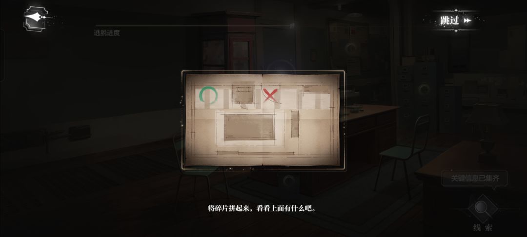 1.地牢 思考: 没画完的正字➕诡异的抓痕 密码:732 2.走廊 注意:调查界面可以向左滑动,电梯不要向下走。 思考: 信的内容➕舞台和月亮 “上来找我”➕异常的电梯 选择:仔细检查电梯→按向上的按钮 3.电话亭 思考: 宣传单上的号码➕名片上的号码 相同的开头➕印反的招聘热线 号码:02852 4.办公室 注意:不要选择撬门离开。 拼藏宝图(如图) 5. 🌹危局通行🌹(柏原) 密码:00001
