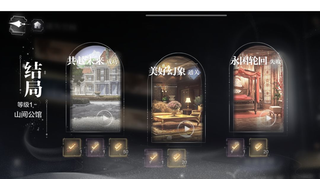 结局一 —— 共赴未来(成功) 第一个房间——正常收集所有的线索后离开房间 线索收集过程如下(可看可不看,收集顺序无关紧要):沙发椅旁"阅读"—木门处"查看"—红酒处"查看"—壁画处"欣赏画作"—"调查画框四周"—"移动"—"开锁",按顺序左1右3左1右4开锁—木门处"用钥匙开门" 第二个房间——正常收集所有的线索并与顾时夜对话,离开房间(简单来说:有蓝圈就点,有对话就去对话) 第三个房间——除开