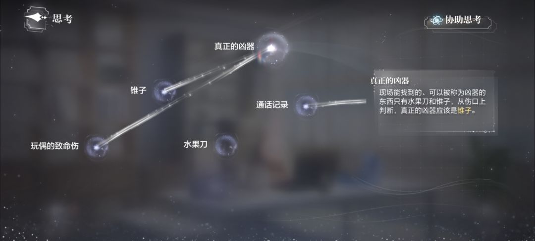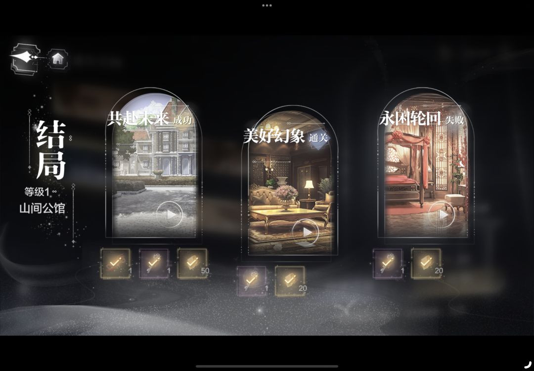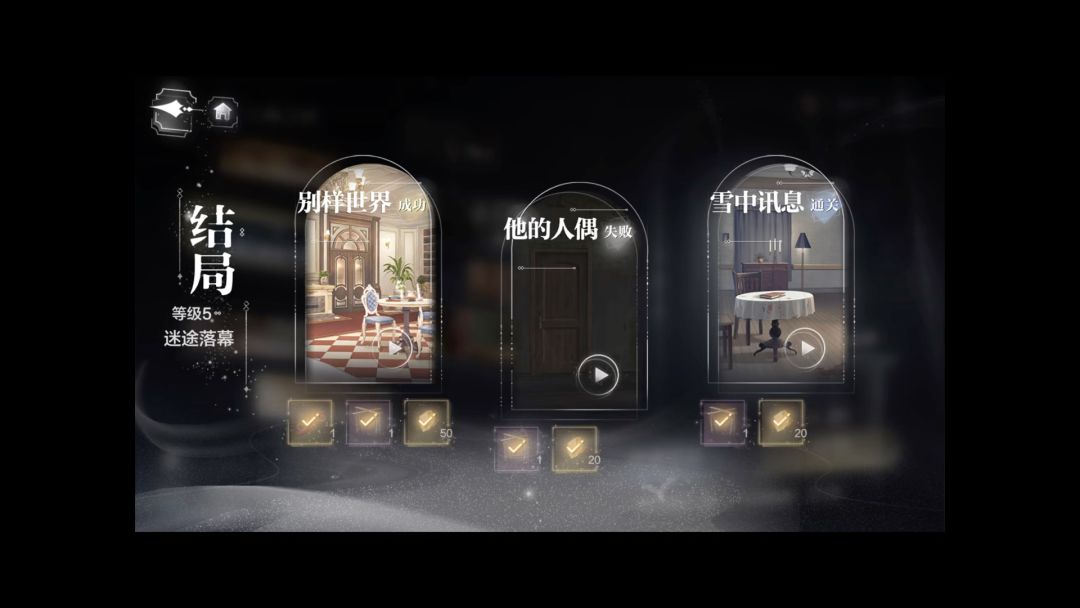 1.视频1:18选择直接开锁出门 获得通关结局 雪中讯息 2.视频1:40时 选择第一项(把针给顾看)继续跟视频 获得成功结局 别样世界 选择第二项(用针刺顾) 获得失败结局他的人偶 tips: 1.协助思考中打关必须要达到一颗心否则过不了,可以试着培养一些相关属性卡或者提升相关属性的藏品 2.我已经通过一遍了,所以有快进按钮 3.此密室关卡所需属性:感知、灵巧、思维 目前所可以获得的藏品 思维: