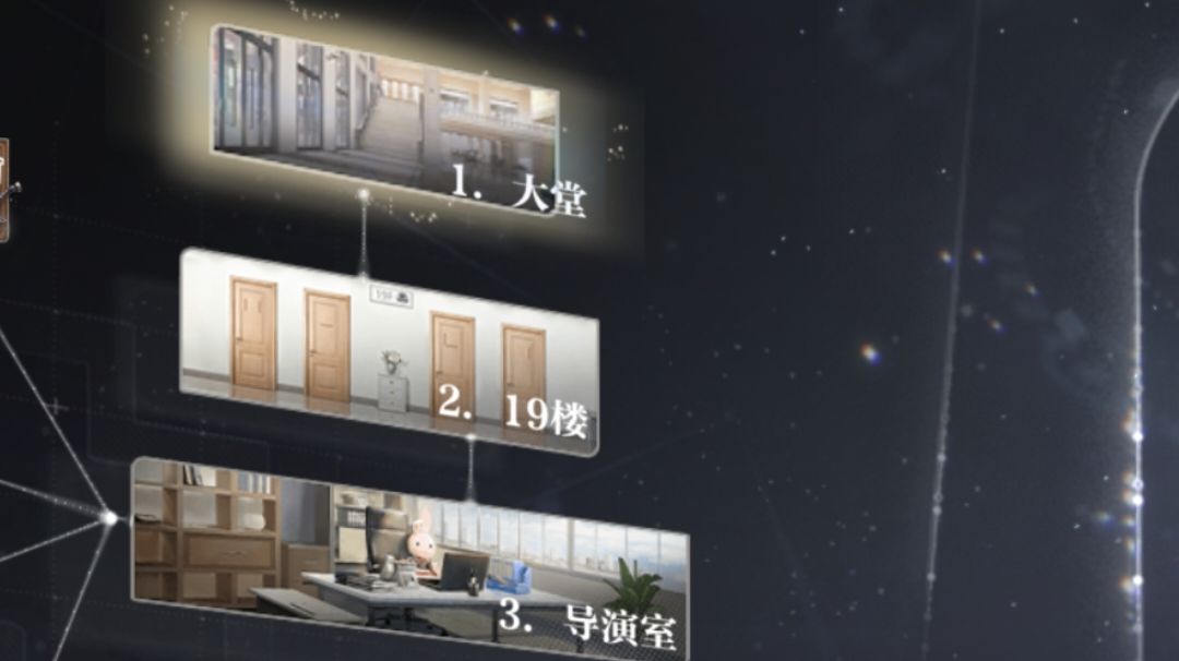 注:没写出来的线索可不收集,帖子结尾有密室综艺四的跳转链接. 一.大堂 摄像头处“查看摄像头”—展示牌处“观察”—休息区处“走进”—“拾起”—前台处“观察”—“照射小孔”—“拿出卡片”(顺序不重要) 镜片旋转如图二 卡片可拖动,将卡片1拖动到如图三所示,出现新线索,如果贴合卡片后没有新线索,那应该是卡bug了,重开试试 (提示,卡片周围闪一圈蓝光才说明重合对地方了,然后卡片会移开,19F那里会出现