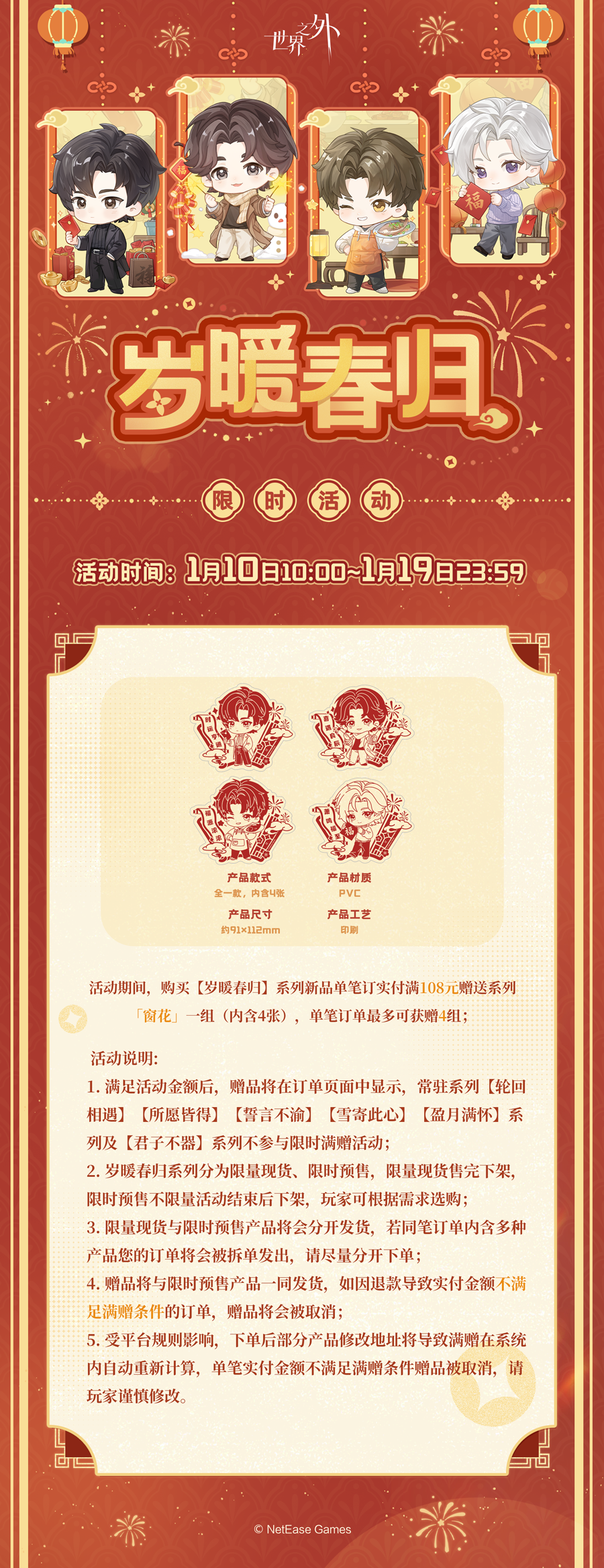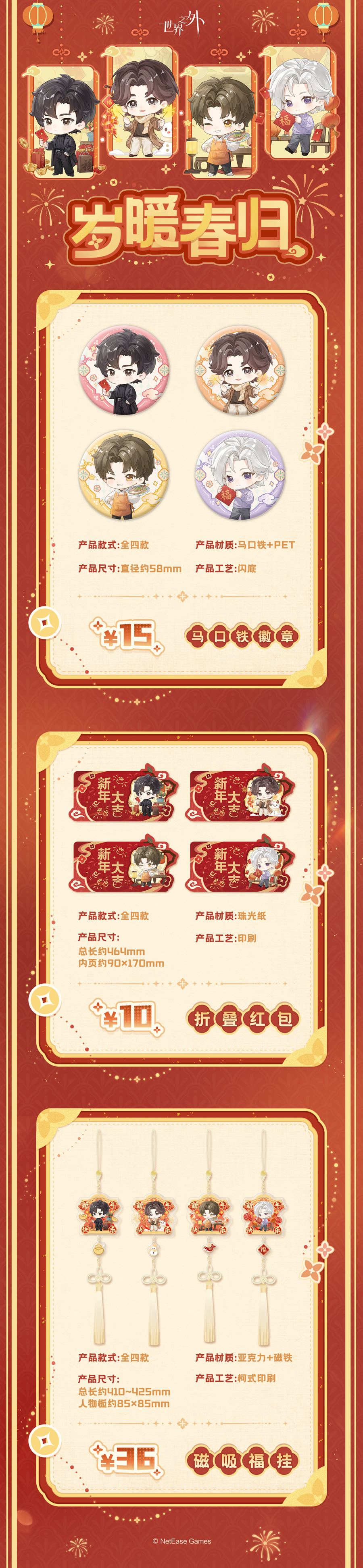 ✦活动现已上架天喵商城,各位玩家可前往天喵商城进行预览选购~✦天喵商城:搜索“世界之外旗舰店”本次岁暖春归系列分为【限量现货】&【限时预售】两种形式,限量现货售完下架,限时预售不限量活动结束后下架,玩家可根据需求选购。 〓 岁暖春归系列 限时预售活动时间:1月10日10:00~1月19日23:59✦岁暖春归(现货):马口铁徽章、新春套组、折叠红包、磁吸福挂✦岁暖春归(预售):马口铁徽章