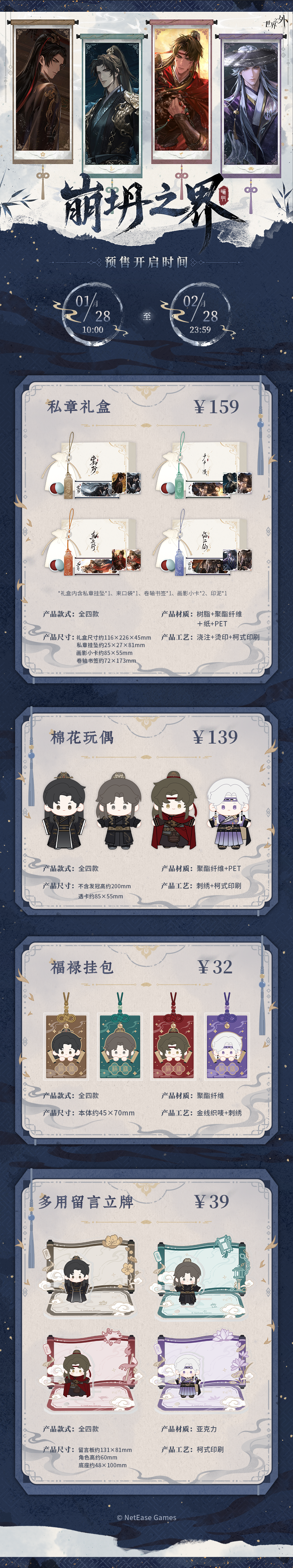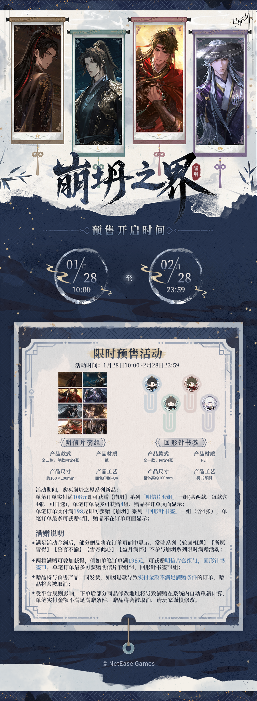✦活动现已上架天喵商城,各位玩家可前往天喵商城进行预览选购~✦天喵商城:搜索“世界之外旗舰店” 〓 崩坍之界系列 限时预售活动时间:1月28日10:00~2月28日23:59✦崩坍之界:私章礼盒、棉花玩偶、马口铁徽章、方形马口铁徽章、侧影卡套组、镭射票、亚克力色纸、角色立牌、屏风立牌、福禄挂包、多用留言立牌 〓满赠说明:活动期间,购买【崩坍之界】系列限时周边✦单笔订单实付满108元即