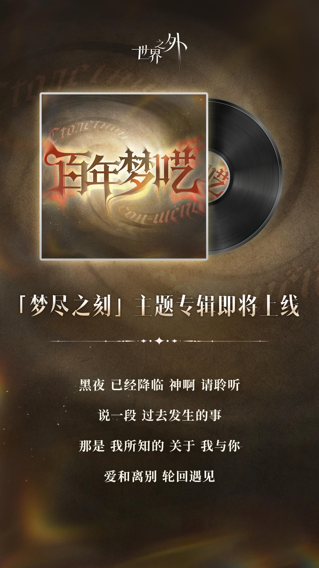 “黑夜已经降临,神啊,请聆听,说一段过去发生的事。那是我所知的,关于我与你,爱和离别,轮回遇见……” 🎶世界之外「梦尽之刻」主题歌:「百年梦呓」中文版、俄语版,将于2月6日0点上线网易云音乐。 ✦点击链接:https://st.music.163.com/music-calendar/share-new/index.html?nm_style=sbt&debounce=false&mai