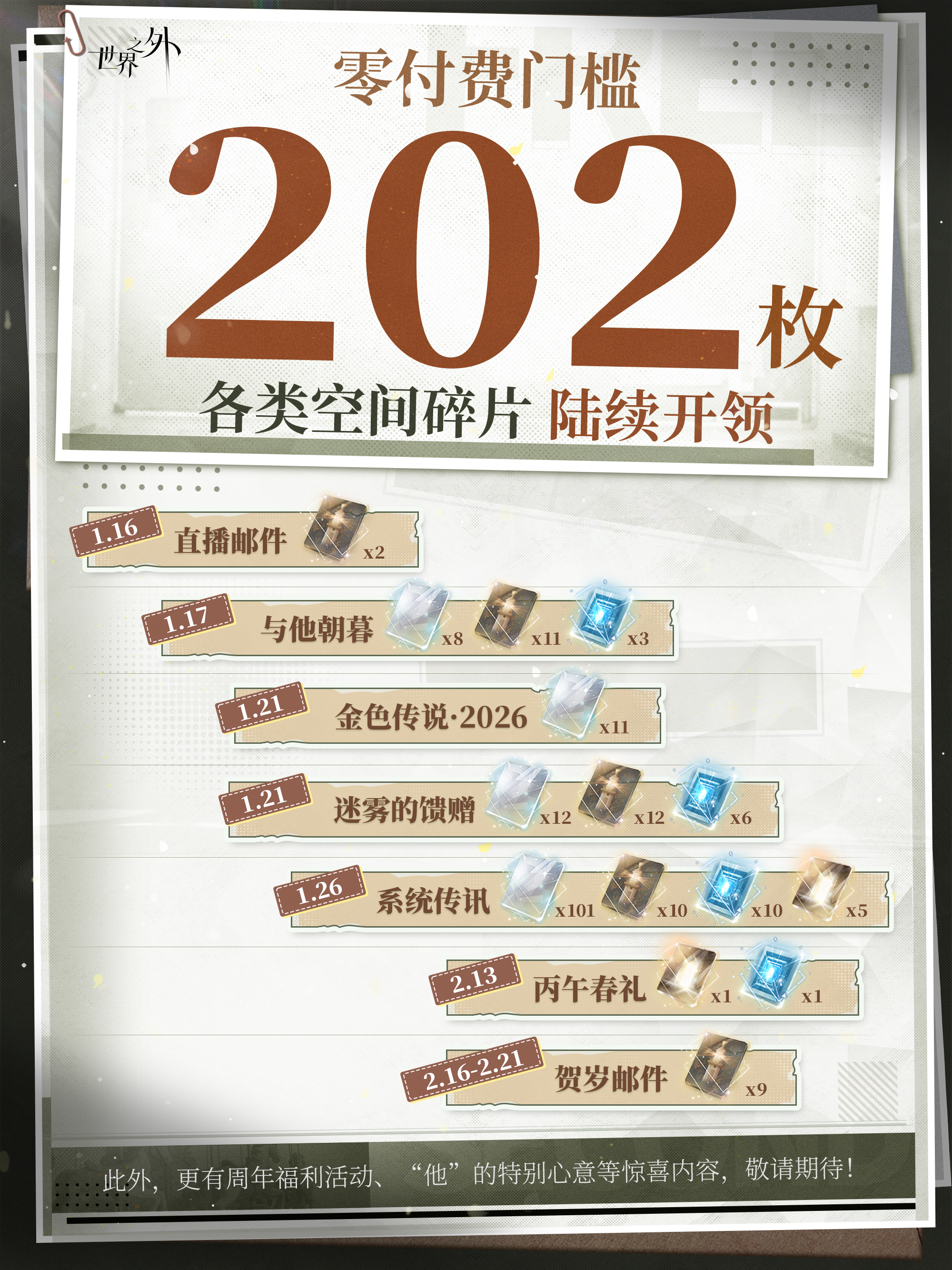 一封神秘的邀请函, 将你带入“有去无回”的危险副本。 面对副本中的重重诡异, 你使用了一个能够保命的道具—— 它能让你成为某故事中的角色,使用角色的能力度过危险。 故事倒是熟悉……《白雪公主》《卖火柴的小女孩》《小红帽》《海的女儿》。 但,剧本好像哪里不对! 梦海之中,有人在你耳边低语,祂说—— “这个世界■■■■■……” 🌫️1月21日起,全新无限副本任务「永雾的低语」开放。 🌫️1月21