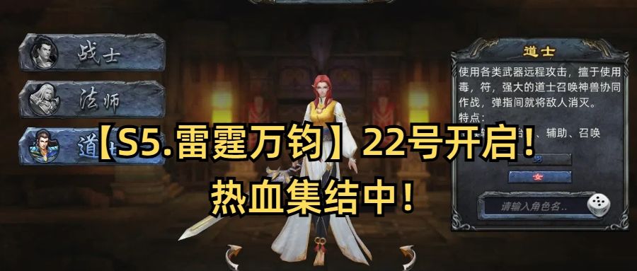 《义战龙城:3D纯净服》新手攻略,纯干货,建议收藏! 《义战龙城:3D纯净服》是一款真正的3D传奇手游,无论是游戏场景还是任务建模都运用了Unity 3D引擎技术,是传奇3D时代的开山之作! 游戏继承了PC端《传奇》180版本的核心玩法,主打一个怀旧和复古,在这里我们可以选择自己喜欢的职业,和兄弟们一起征战玛珐大陆! 开区通知 龙年专属『S5.雷霆万钧』3月22日13:00开启! 开荒攻略 与市面