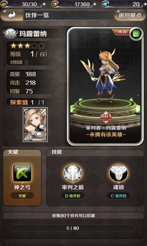 审判者·玛露蕾纳 CV:刘婧荦 故事背景:原本是神族的战士,现在是留在大地上的神使之一。 玛露蕾纳实际上是神族的审判者。作为审判者,她留在大地的原因也很简单,对于背叛神族的人们,她主张需要更多的观察,来研究背叛的动机;这并非是她对人们的怜悯,仅仅是她在尽自己审判者之职。 玛露蕾纳手中的审判之弓,可以发出射穿灵魂之箭,直接对灵魂进行审判。 角色属性介绍: 属性克制:克制风属性 天赋:神之弓 N:消灭