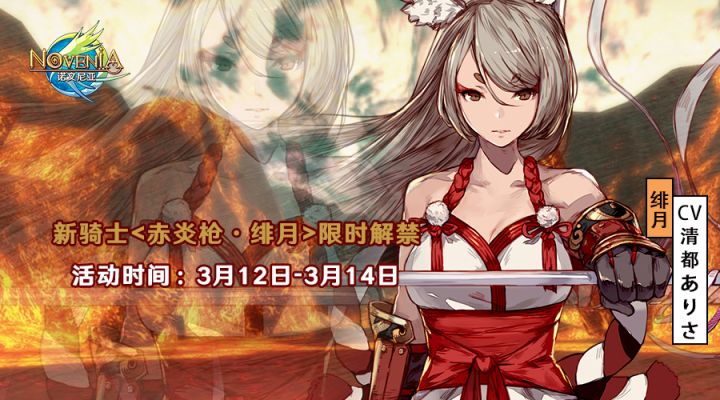 《诺文尼亚》正在火爆公测中。精美的日式二次元画风,创新的连珠玩法深受广们的一致好评。为了感谢各位冒险家对游戏的支持与喜爱,这期我们将新的骑士角色<赤炎枪·绯月>带给大家。还没有入手绯月的冒险家一定要珍惜本次机会唷~!新骑士<赤炎枪·绯月>限时解禁活动时间:3月12日0:00~3月14日23:59解锁姿势:限时招募获取方式:玩家在活动时间内,登录游戏并参与该活动,即有机会获得新角色赤炎枪·绯