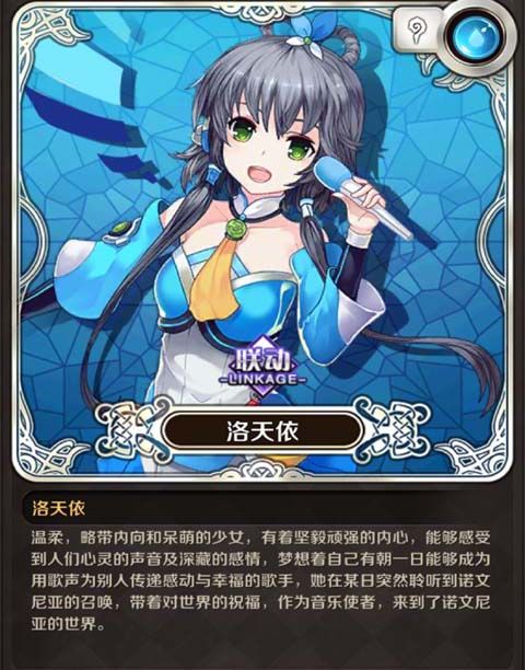 洛天依CV:暂无故事背景:温柔,略带内向和呆萌的少女,有着坚毅顽强的内心,能够感受到人们心灵的声音及深藏的感情,梦想着自己有朝一日能够成为用歌声为别人传递感动与幸福的歌手,她在某日突然聆听到诺文尼亚的召唤,带着对世界的祝福,作为音乐使者,来到了诺文尼亚的世界。角色属性介绍:属性克制:克制水属性天赋:共鸣N:消除5颗星,有几率生成1颗血瓶D:开启被动技能C:开启主动技能B:血量低