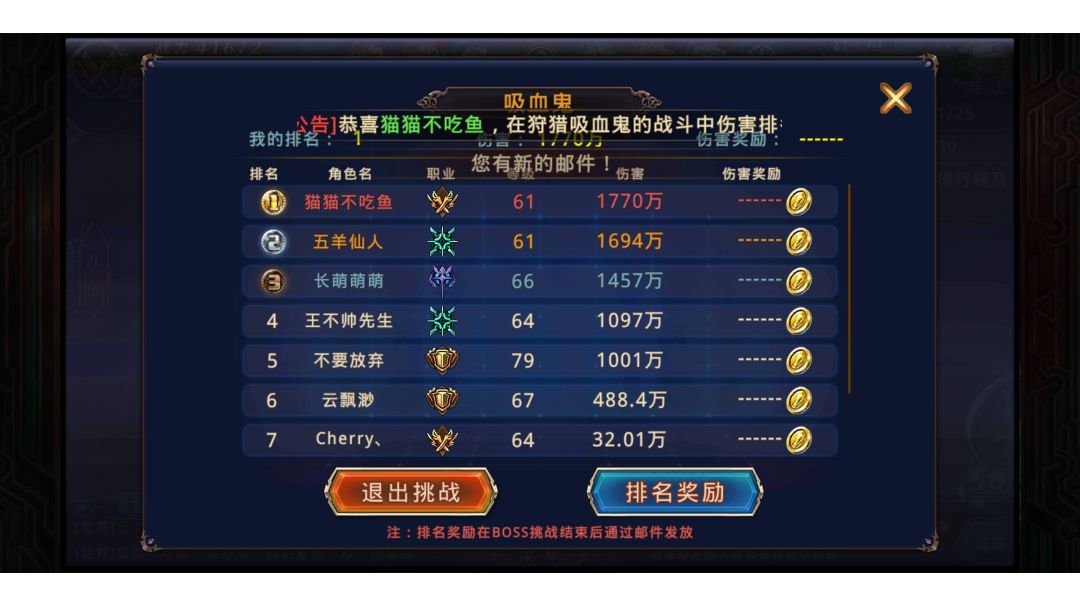 游戏里最快乐的事莫过于和小伙伴们一起打boss啦~虽然伤害低但我们胜在有复活吖~ 兵法云:兵不在精,在于多!于是我们三个四万战力的新手技师使用车轮战术,帮助吸血鬼先森提供了近一个小时的刮痧服务,最终拿下前三,当事鬼表示很满意,明天还会来😂