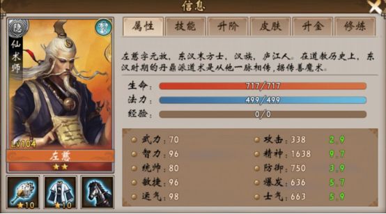 首先这篇攻略,请允许我用比较长的篇幅来写,里面包含了我对这些武将和装备的理解,应该会按几部分发,先发第一篇,武将装备篇,因为这一个阵容的武将和装备,算是我总结下来,比较稳,容错率高而且效率也不差的阵容,相对来说,足够平民,V9的阵容,从氪金的角度也完全可以接受,基本上每一个出场的武将和装备,都做到人尽其才,物尽其用。话不多说,进入主题: 先看出场武将,截图如下: 1. 左慈:2星左慈,白羽扇+鹤氅