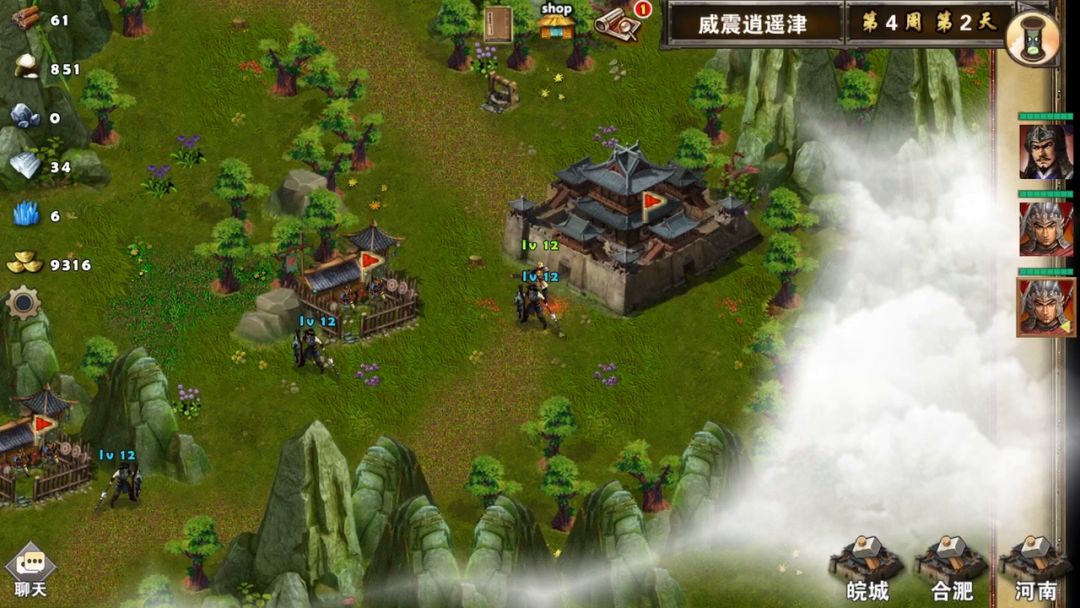 4周后李典夺下合肥,张辽、乐进合理利用进出城的方法吸引徐盛过去,给李典争取时间打青龙和狼王,然后李典恢复好状态堵在合肥桥头,张辽、乐进进城,徐盛会停留原地不动,后面全力发展城池,招募朱雀、炎雀,河南和皖城铜雀台升一级即可,合肥要把铜雀台升级到朱雀台,并且要查看每天的粮食储备不能低于1000,不够就用金钱换,大概8周3左右李典可以去打徐盛,打徐盛的时候要注意,徐盛残血时每过2回合会招募一组仙术师和鹰