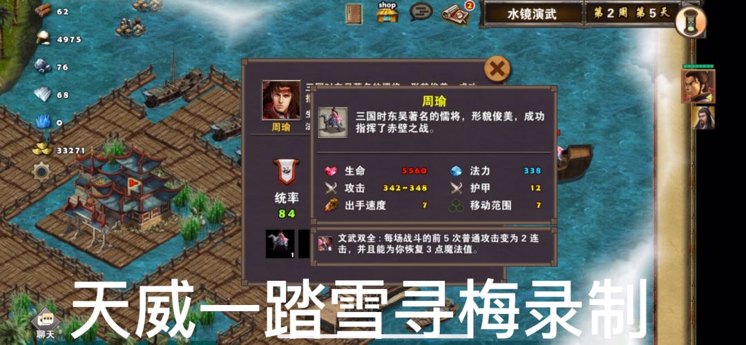 2周5周瑜出现在右边水面上,二话不说过去打,注意周瑜的火阵和疑兵之策技能,特别是业火之阵烧人很疼,所以最好刷开局周瑜不释放业火之阵,打法就不细说了,优先杀掉周瑜,最后清兵,两个英雄注意加血尽量不要损失丹阳,具体打法、行动路线详见视频