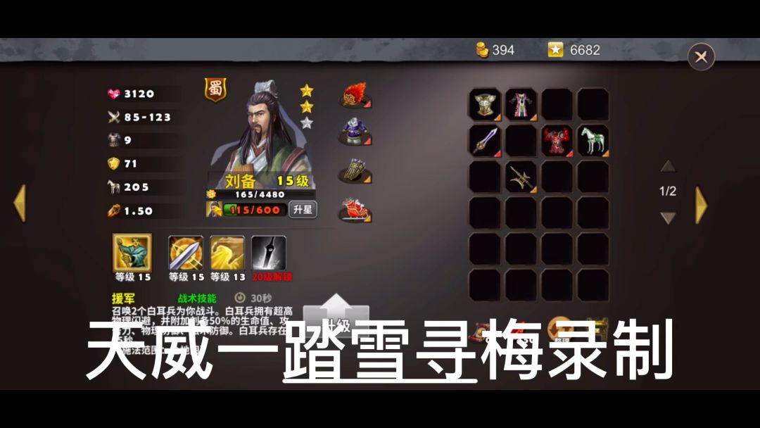 英雄出装: 诸葛亮:朱雀羽扇、清灵头、天玄衣、将军鞋、招财猫、龙佩、太平要术 孙权:朱雀羽扇、英杰头、天玄道袍、虎鞋、招财猫、龙佩、太平要术 周瑜:朱雀羽扇、英杰头、天玄道袍、虎鞋、招财猫、龙佩、太平要术 卡片出装:无 打法思路:开局选诸葛亮,孙权下河和周瑜对话诸葛亮脱离队伍这里兵分两路。孙权右边走直接上岸拿智力buff然后回走避开敌方鹰卫将领的战斗,诸葛亮和鲁肃干掉敌方武将。隔天诸葛完成任务以后