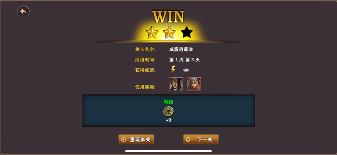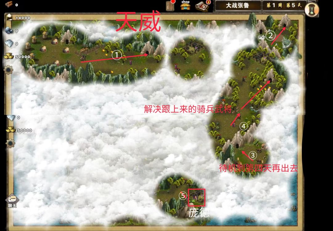 击败庞德 奖励:10金币(月卡翻倍) 推荐英雄:张郃、曹操、司马懿、许褚 打法思路:开局夏侯渊把骑兵全部给张郃,张郃把兵力集中然后分成两组进洞,在虎豹骑洞穴待到第四天出洞解决靠近曹操的敌方武将杨任,然后和曹操对话,曹操带上司马懿许褚往上方洞穴走进去以后庞德就在山寨里面。 击败甘宁 奖励:10金币(月卡翻倍) 推荐英雄:张辽 打法思路:开局待机到孙权来攻下城池,然后我们把城池打下来激活甘宁登场,接下