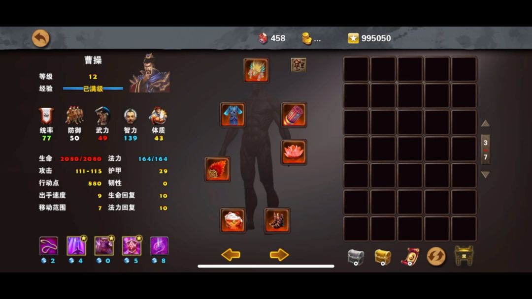 曹操装备推荐:朱雀羽扇、天璇法袍、万灵冠、太平要术、红莲花灯、招财猫、虎纹金缕鞋或者猛将靴,个人推荐曹操使用猛将靴,这样更容易亮大,曹操这身装备一般不太容易亮大,如果统率达到75以上进图访问两个神庙选择10统率,可以轻松亮大,反过来说如果曹操统率达不到75,神庙属性就不要选择统率加成了,直接全部选择10智力,增加朱雀羽扇和太平要术的伤害。 进入地图后,战术卡可以使用威震四方和虎翼阵,然后曹操根据自身装备属性情况去访问右边神庙选择智力或者统率加成,并把右下角凉亭也访问了,然后一直等到2周以后去打桥上虎卫(2周后打虎卫是为了提高出卡率),曹操装备如果不是太好一般单挑吕布有可能会翻车,可以去攻打荥阳,然后驻守荥阳等待吕布过来攻城,利用朱雀羽扇打掉吕布的投石车,可以轻松灭掉吕布,然后一路过去打掉高顺,在洛阳城附近等到6周以后(为了提高出卡率)就可以攻城打董卓了,期间有荥阳城右边虎豹骑、臧霸、貂蝉、李儒都有机率掉落黄色战术卡,可以选择打或者不打。打败董卓后便可以过关,有机率获得黄色战术卡,同时会获得吕布宝箱(不打吕布没有吕布宝箱),附视频