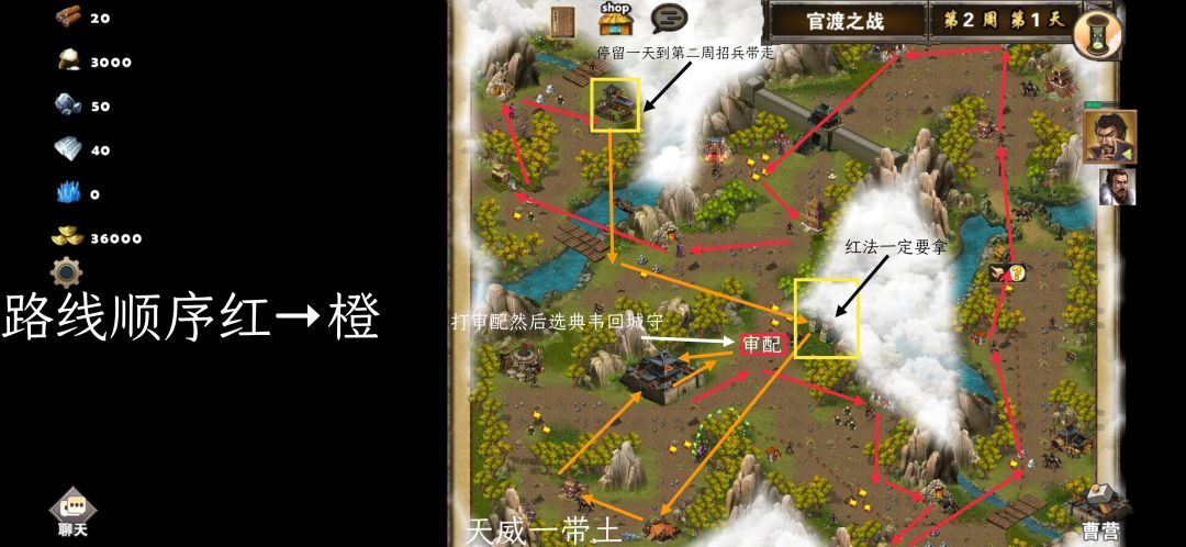 主将:曹操 推荐副将:夏侯惇(吕布、贾诩) 英雄出装: 收副将后曹操:雌雄剑、少典甲、凤头(万灵头)、吴子、春秋、幼麟鞋、木牛流马 前期曹操:朱雀火扇、天玄道袍、万灵头、龙佩、太平要术、虎鞋、招财猫 夏侯惇:血煞、勇士甲(蛮皮甲)、狂魔头(疯魔头)、金刚琢、东皇(五色、龙鳞护腕、虎威令)、虎鞋(雁荡鞋)、黑熊 推荐兵种:红法、玄武、朱雀 推荐卡片:金币卡、粮食卡、天人合一、玄武之痕 时间限制:三周