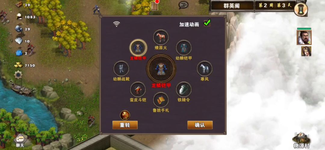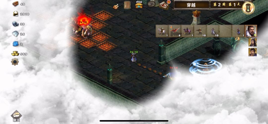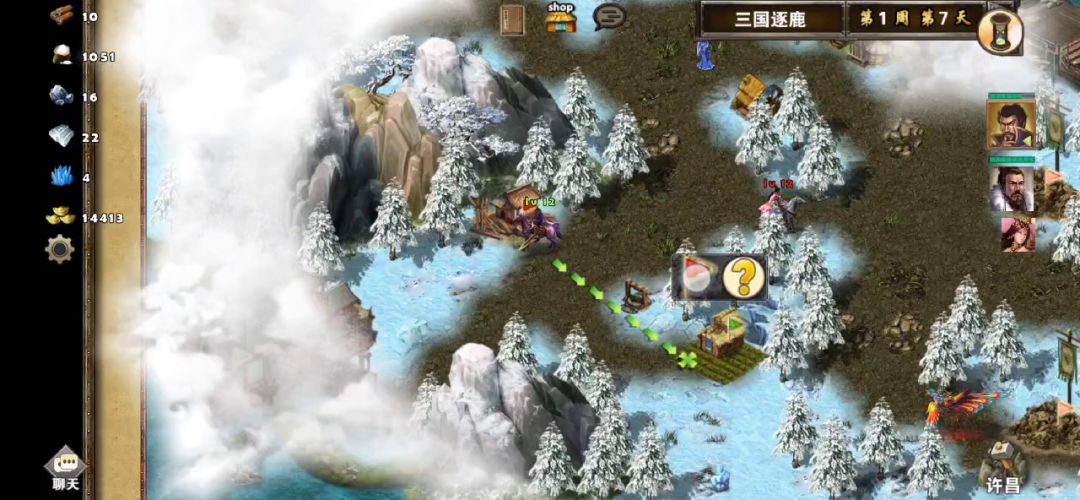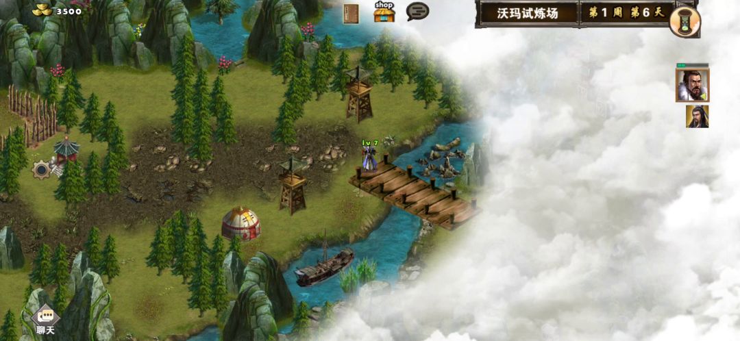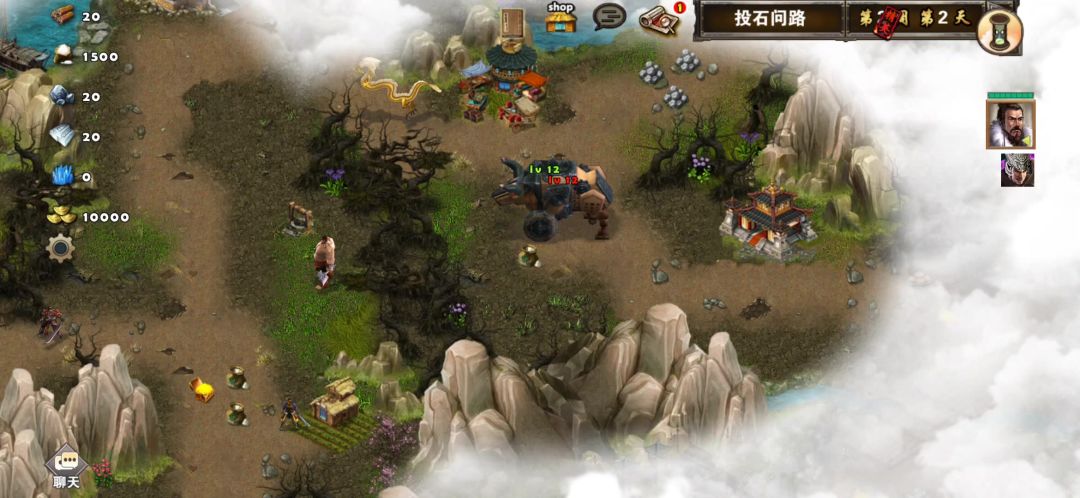 这关比上一关稍微难点,可以使用三个英雄,其中前两个英雄可以自选,第三个英雄随机,如果第三个英雄想使用自己选定的英雄,可以去刷,建议使用贾诩、刘备、曹操,开局第一天贾诩往右下打小怪对话刘备加入队伍,旁边帐篷可以访问回血,然后往上走打掉哨塔守卫小怪访问哨塔,第二天可以看见前面有一组兵可以招募(兵种随机),然后打掉前面神像守卫小怪访问神像,继续往前走有四个黄金宝箱捡起来,旁边有个青龙崖可以招募青龙,资源