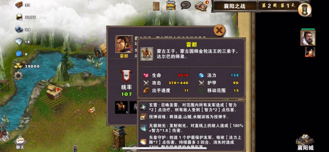 打败蒙古铁骑后把左边资源收刮一通,有一组法师可以免费招募,之后往右走可以看见有边桥上有个boss霍都把桥堵了,没办法只能上去打了,把兵分组吸引伤害,注意霍都装备有朱雀羽扇,还会孙权的技能,另外霍都所带兵种都是随机的,每次打可能不一样,刷开局霍都不使用朱雀羽扇,贾诩先清兵,如果对面有鹰卫,杨过要过去贴身鹰卫,行动的时候我方的兵尽量分散开,免得被霍都扇子一下子烧没了,另外如果霍都给谁加盾,要尽快把盾打