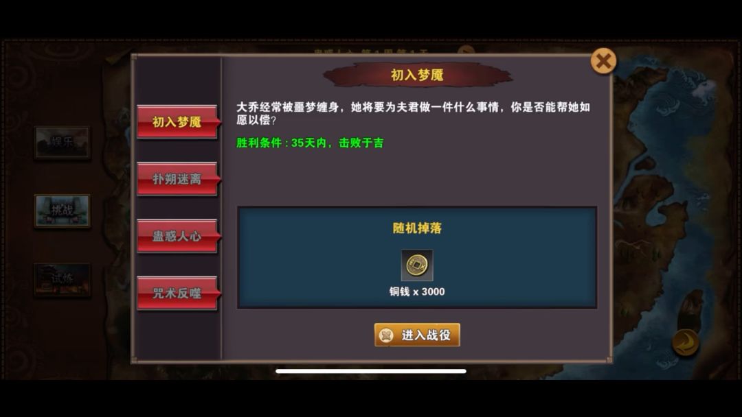 这一局很简单,新玩家可以想办法搞一把火扇打这一局,用雷杖也可以,武将用刘备即可以回血保命,又能杀伤敌人,打够了场次就能拿到三颗星,对做任务的玩家,推荐用司马懿,或者贾诩,这个视频是司马懿为主将的通关视频,一共没几次战斗,通关的条件是击败吕布,吕布在右上角,通过传送点能更快的完成任务,利用司马的技能,一个个的清掉小兵后,基本吕布就残血了,轻松搞定,请参考视频。